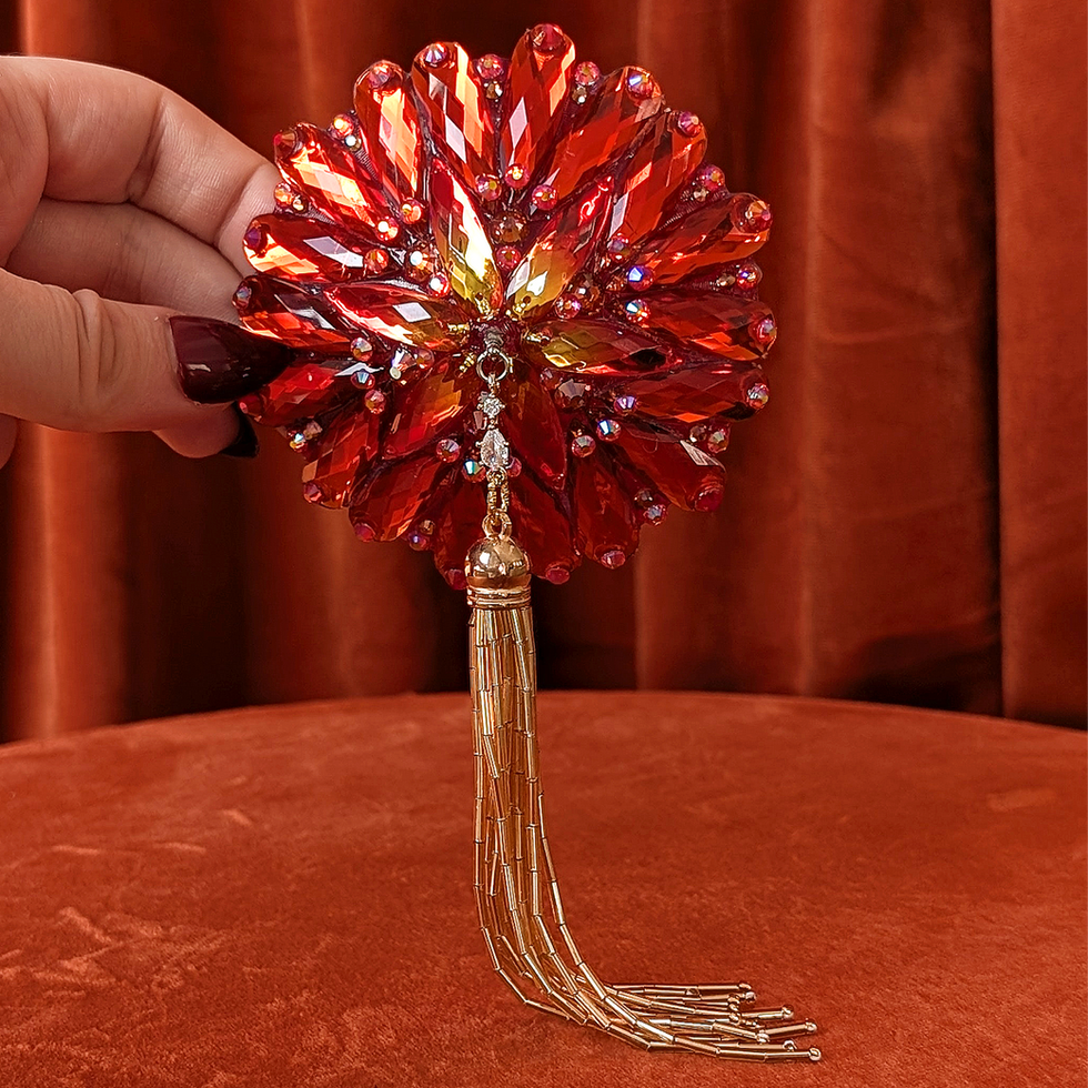 Decorated with a luxurious amount of various crystals and acrylic stones in various sizes, crafted on a black 3D printed base, featuring a stainless steel spinner and gold tassel made of glass beads.